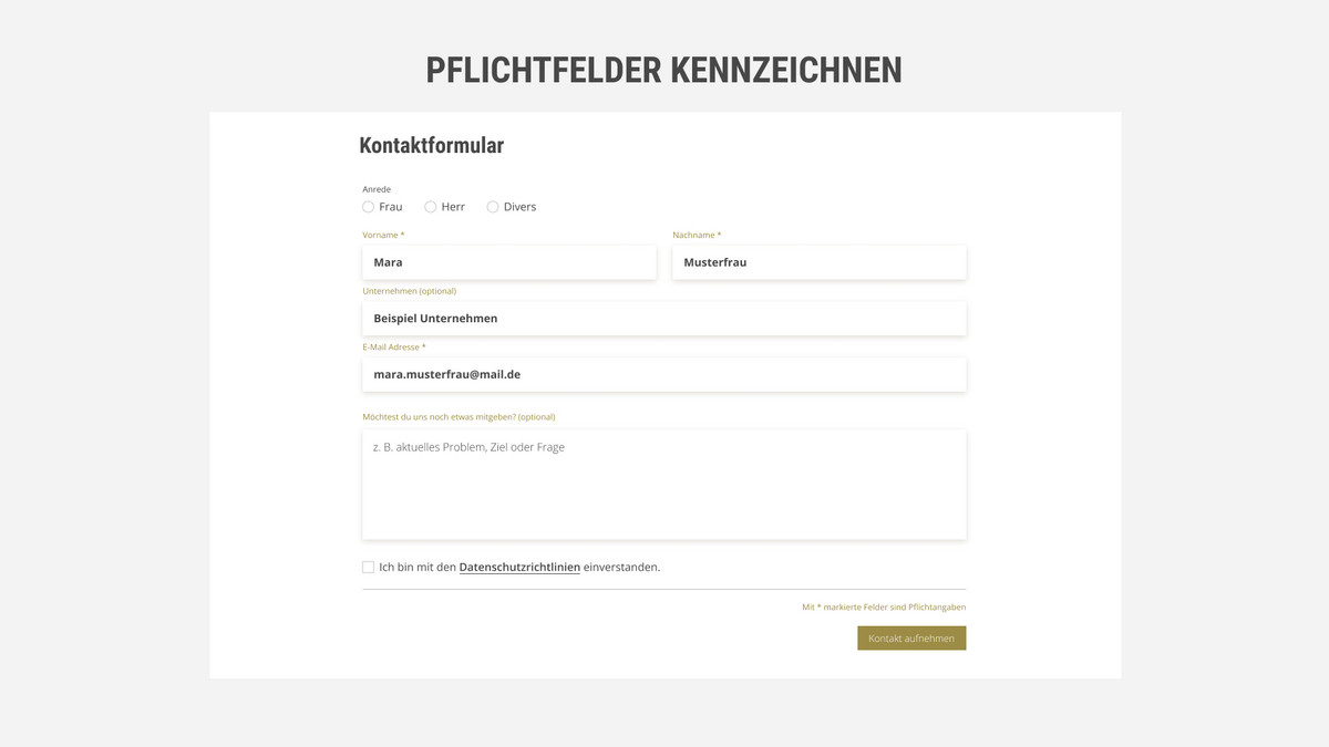 - Die meisten Felder sind Pflicht? Hinweis wie „Alle Felder sind Pflichtangaben, sofern nicht anders gekennzeichnet" nutzen und nur die wenigen optionalen Felder markieren.