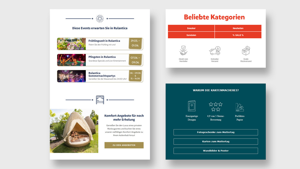 Für den Aufbau der Newsletter-Vorlage bietet sich eine modulare Gestaltung an. Einzelne Inhaltsblöcke können flexibel kombiniert, neu angeordnet oder ausgetauscht werden – ideal für regelmäßige Newsletter. Module erleichtern zudem die Wiederverwendbarkeit von Layouts und fördern eine konsistente Darstellung.