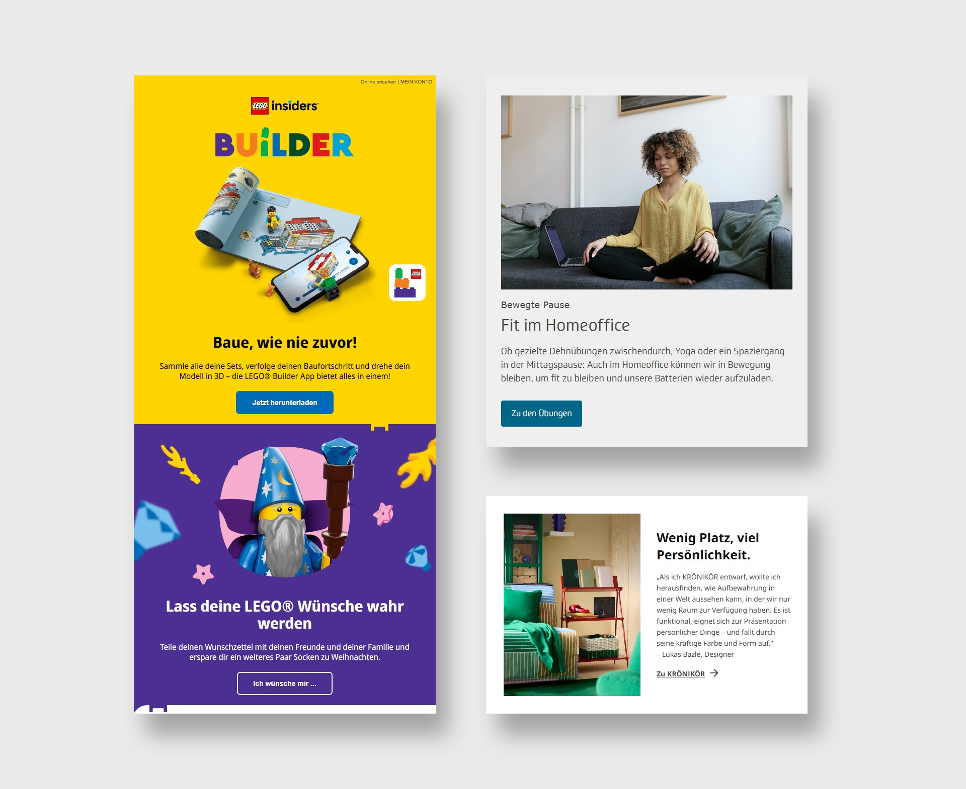 Praxisbeispiele für modulare Inhaltsblöcke mit Call-to-Action: Links: LEGO, rechts oben: Techniker, rechts unten: IKEA