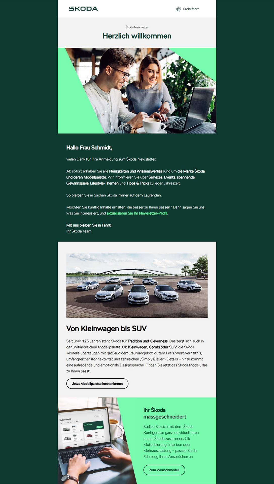 Praxisbeispiel für eine gelungene Umsetzung des Corporate Designs: Skoda Newsletter – Das Corporate Design der Marke ist klar erkennbar. Farben, Schriften und Designelemente haben einen starken Wiedererkennungswert zur Website. Die modularen Inhalte sind klar strukturiert (Bild, Headline, Texte mit hervorgehobenen Passagen, Call-to-Action) und gut lesbar