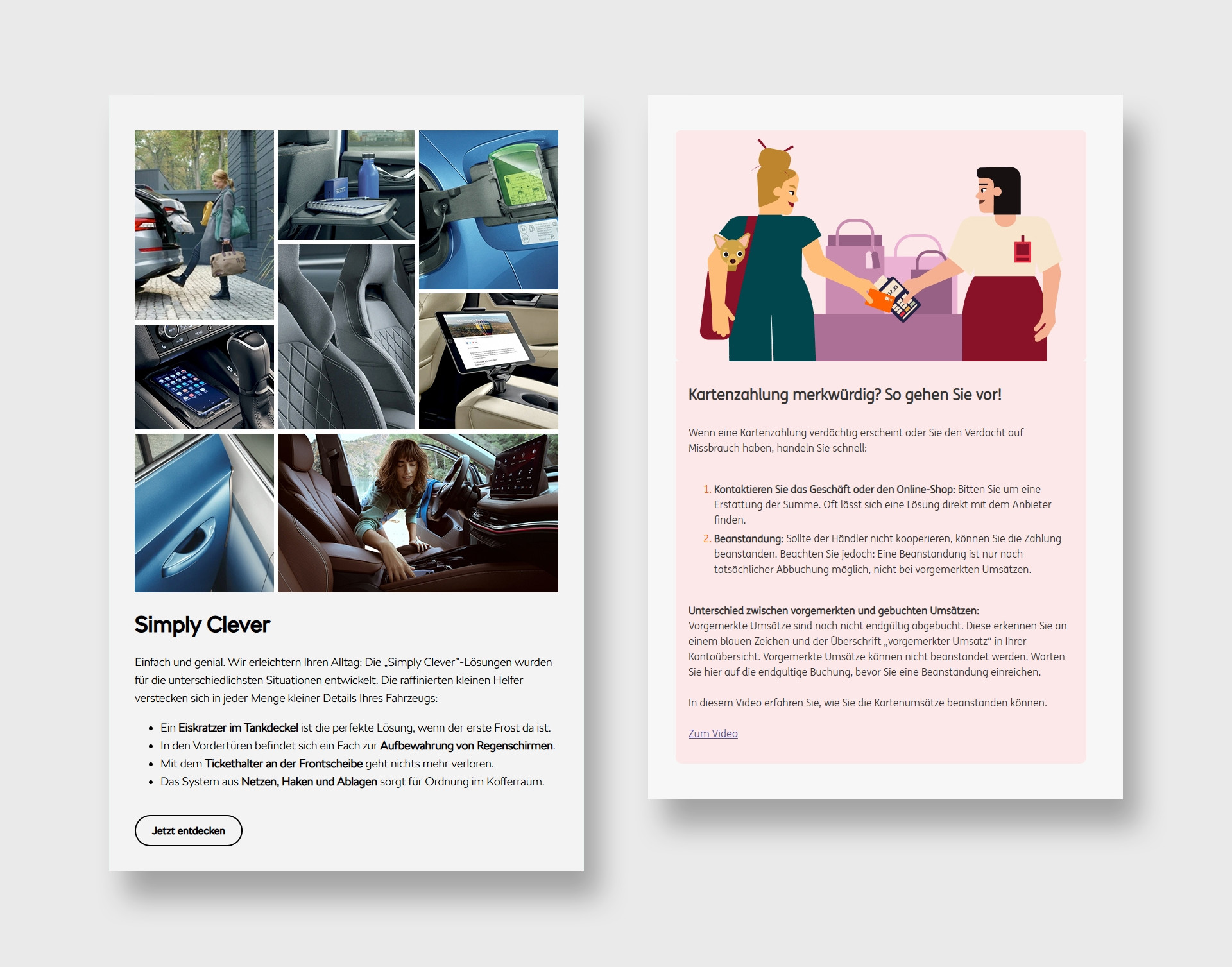 Praxisbeispiele zum Thema Bilder & Grafiken:  Links: Skoda Newsletter – Eine Collage aus mehreren Bildern lockert das Design auf Rechts: ING Newsletter – Einsatz einer Illustration zur optischen Aufwertung des Inhaltsmoduls