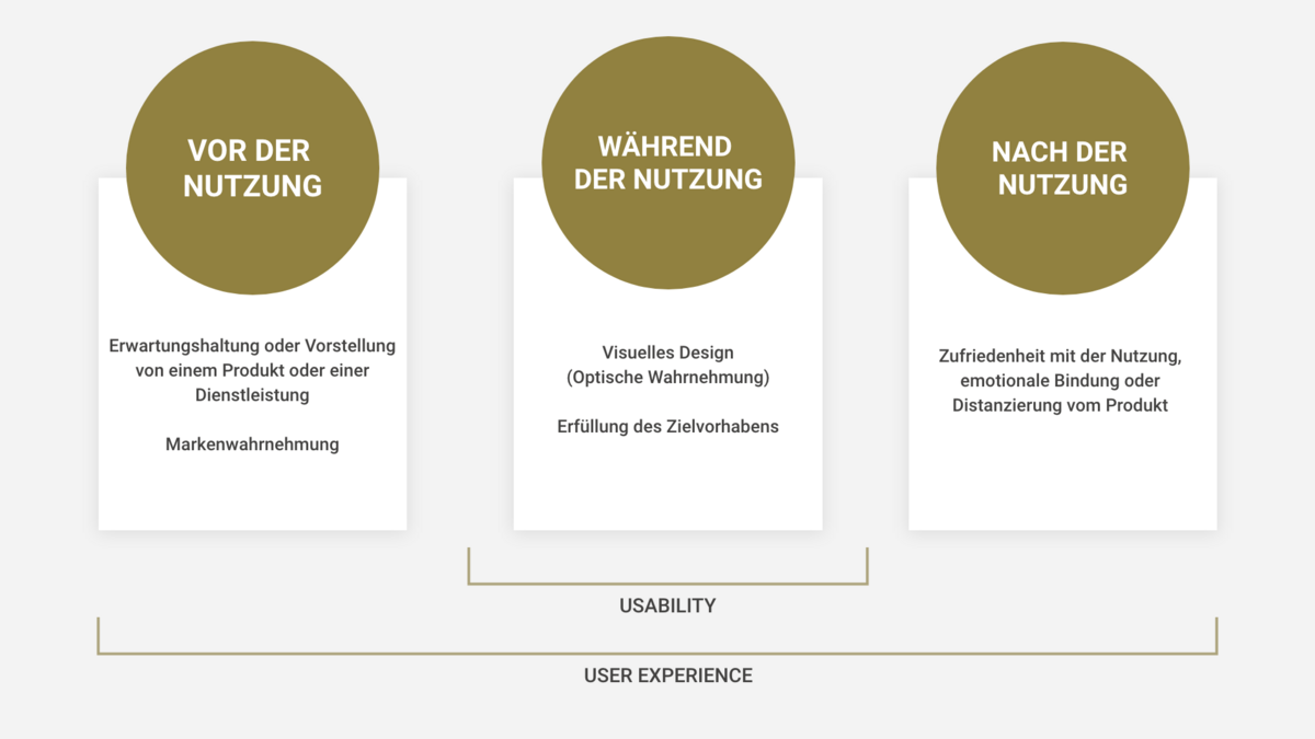 Zwei Tage später bekommen Sie eine E-Mail, dass sich die Lieferung verzögert, da das Produkt nicht auf Lager ist, obwohl davon nichts auf der Webseite stand. Also bekommen Sie Ihre Bestellung erst zwei Wochen später und leider kaputt. Sie müssen daher den Kundenservice kontaktieren und eine Retoure beantragen. Telefonisch erreichen Sie niemanden, weshalb Sie eine E-Mail schreiben. Die Antwort kommt erst Tage später. Letztendlich erhalten Sie ihren Retourschein und schicken das Produkt zurück, bekommen aber kein neues und müssen auf der Website neu bestellen oder direkt im Laden holen. Hier bewegen wir uns im Bereich der User Experience, die in diesem Fall nicht positiv war. In diesem Fall wollen Sie das Produkt wahrscheinlich nicht mehr haben, obwohl die Usability-Erfahrung auf der Website sehr gut war.