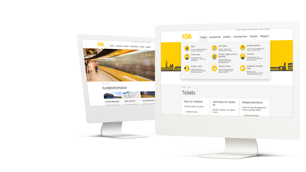 Die Website spielt in der Kommunikation der SSB eine wichtige Rolle um das hohe Informations- und Servicebedürfnis der Nutzer:innen zu bedienen. Die Fahrplanauskunft, Tarifinformationen, aktuelle Störungen, aber auch der Fahrscheinkauf, die Verwaltung des Abonnements oder der Kontakt zum Kundenservice, sind oft aufgerufene Bereiche der SSB-Website.
