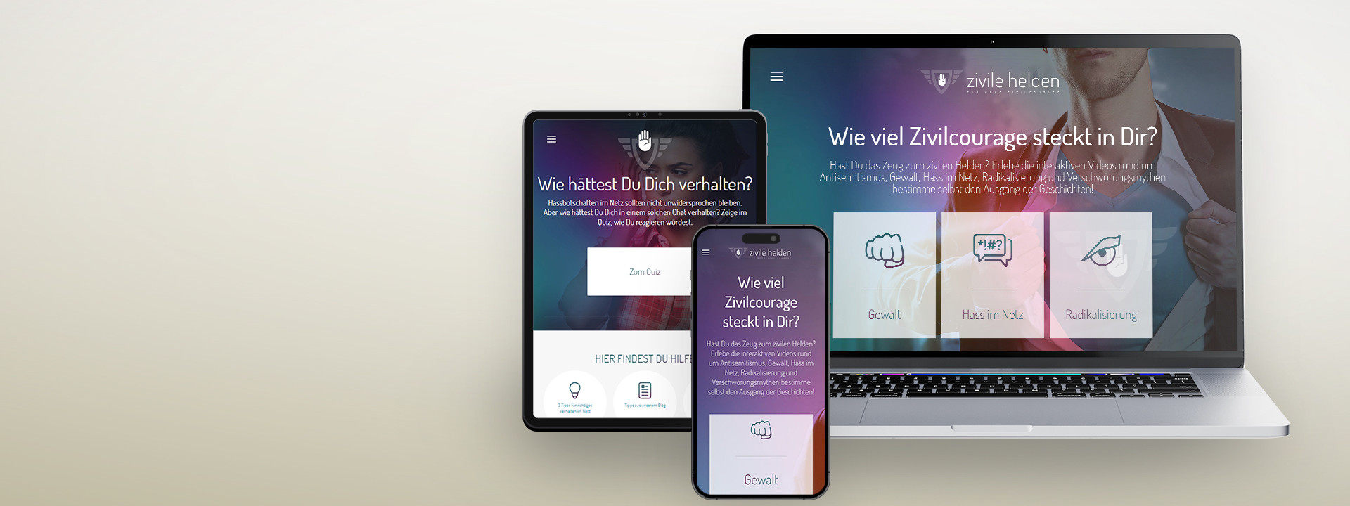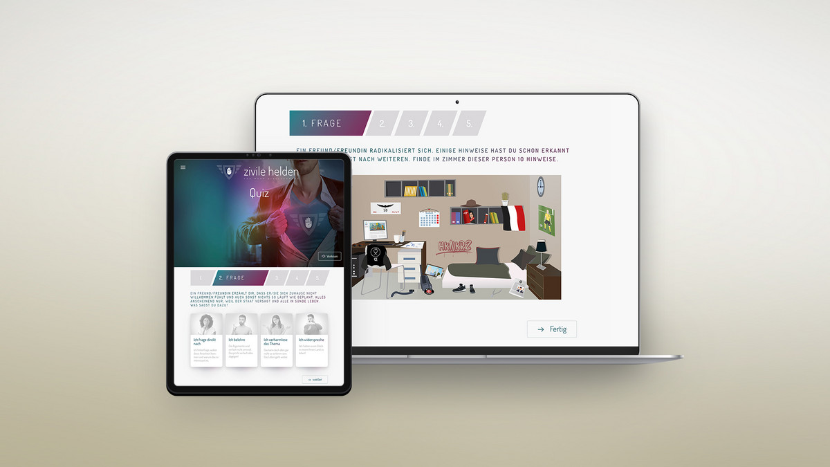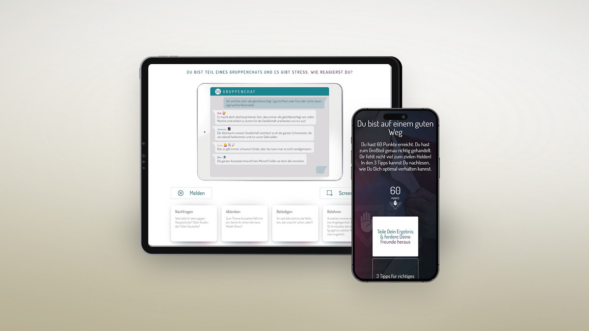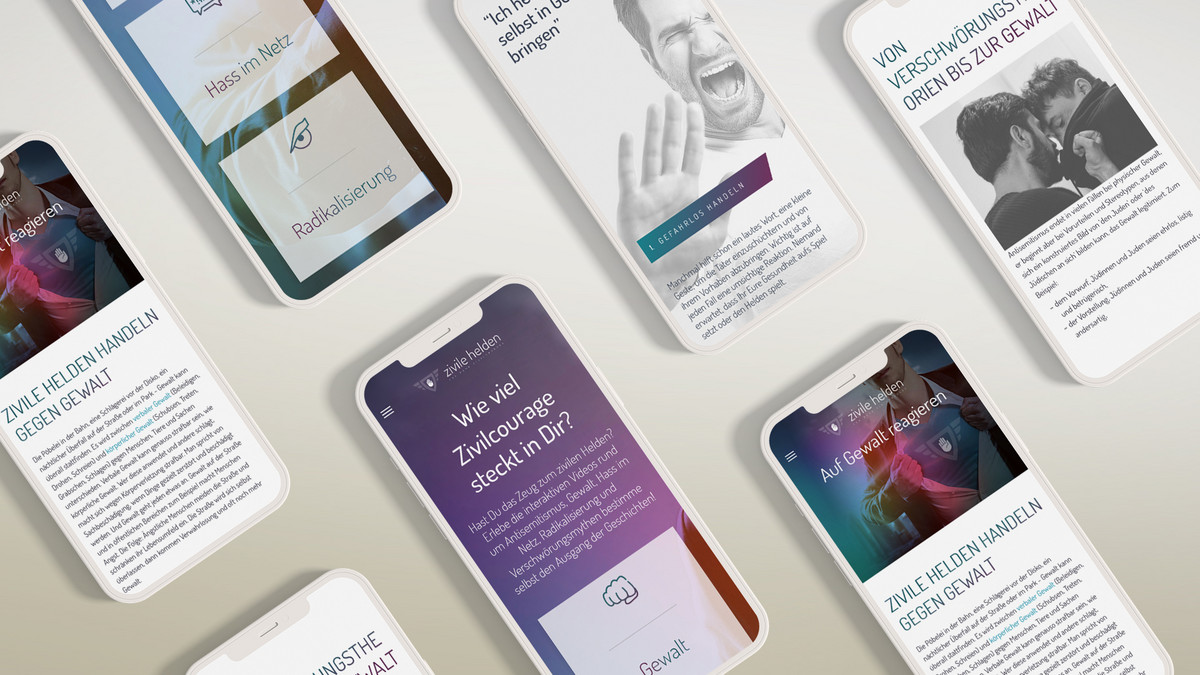 Gemeinsam mit den Verbundpartner, darunter das Bundeskriminalamt (BKA) sowie die Hochschule der Medien (HDM) führten wir das Forschungsprojekt zum Thema „Präventive digitale Sicherheitskommunikation in sozialen Online-Netzwerken“ durch. Initiiert wurde das Projekt vom Bildungsministerium für Bildung und Forschung. Mit “Zivile Helden“ entwickelten wir eine innovative Plattform, die spielerisch und informativ das Bewusstsein für Zivilcourage schärft. Anhand interaktiven Videos werden die Zuschauer:innen in das Geschehen einbezogen, indem sie unterschiedliche Handlungsalternativen ausprobieren können.