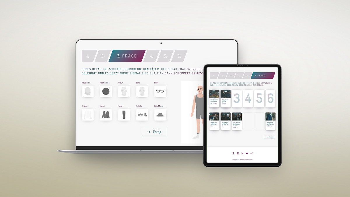 Neben der interaktiven Aufbereitung des Videos haben wir auch wieder passend zu den Zivilcourage-Tipps ein Quiz entwickelt, bei dem die Aufmerksamkeit und Kenntnisse der Nutzer:innen passend zum Video getestet werden. Teil der Quiz-Mechanik waren klassische Fragen mit Einfachantworten, Aufgaben zum Sortieren von Story-Fetzen, Abbilden von Personen und vieles mehr.