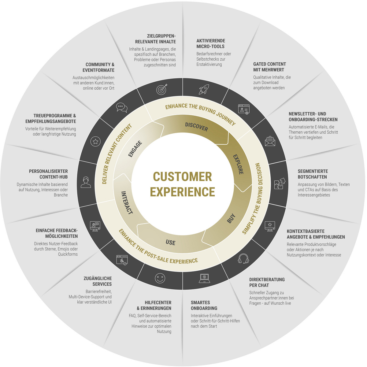 Die Grafik zeigt auf einen Blick, wie ganzheitlich Customer Experience gedacht werden muss und wo konkrete Maßnahmen entlang der gesamten Customer Journey wirken können. Von der ersten Suche bis zum langfristigen Kundenkontakt: Jede Phase bietet Chancen, digitale Touchpoints wirkungsvoll zu gestalten.