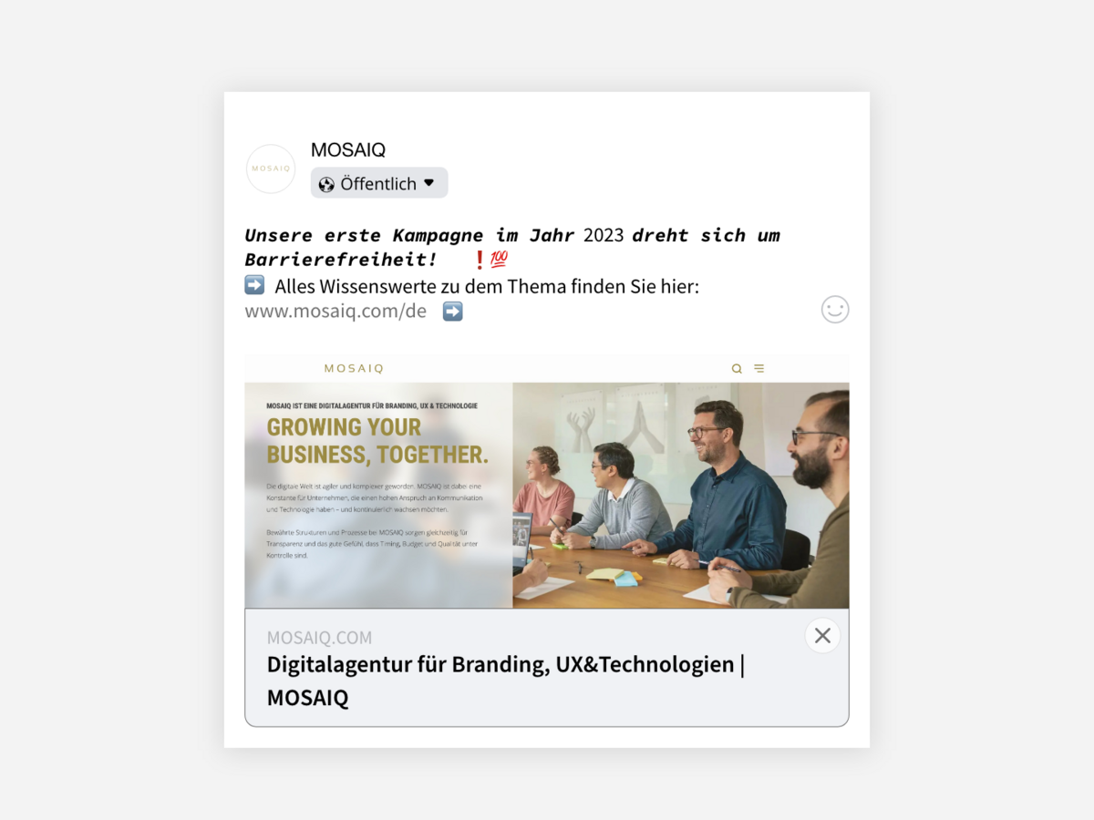 Sure, it definitely catches the eye immediately because of the different font and the emojis used. However, the post is not suitable for people who rely on a screen reader to use social media. You can find out why this is the case and what else needs to be considered when it comes to accessibility for social media in our blog post.