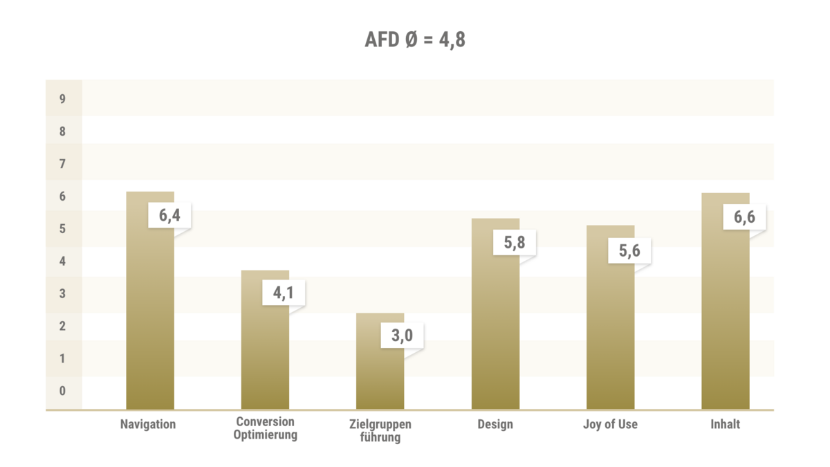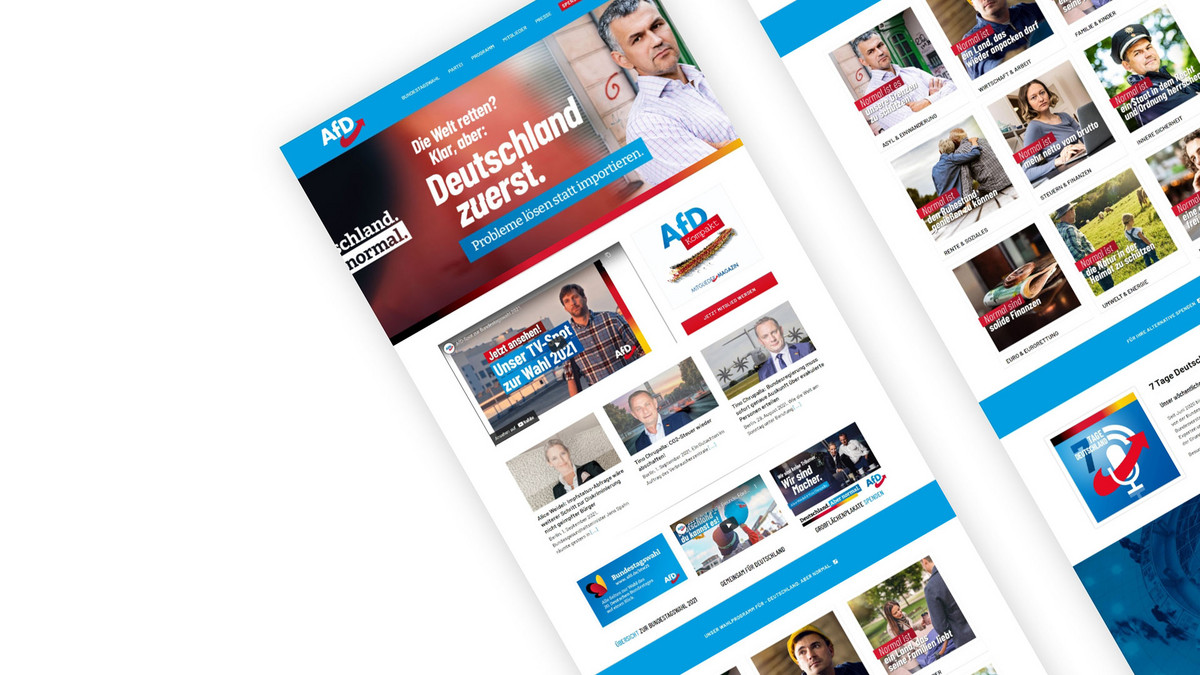 The entire content of the website has a clear focus on party objectives and often only serves the user-oriented scenarios by linking to PDFs, sometimes not at all. The target group is only reflected in the website to a limited extent. Although the imagery often corresponds to the party posters and conveys a uniform image, more pictures of AfD members could be shown. As a result, the impression remains professional, but somewhat unapproachable and staged.The AfD website is very striking and visually appealing. The content is sometimes quickly overwhelming due to the numerous headlines and texts on the images. The images, especially the poster motifs, are of high quality and evoke emotions. The choice of images is harmonious, but the similar depiction of individuals makes it look boring and staged in the long run. More authenticity would be useful here.