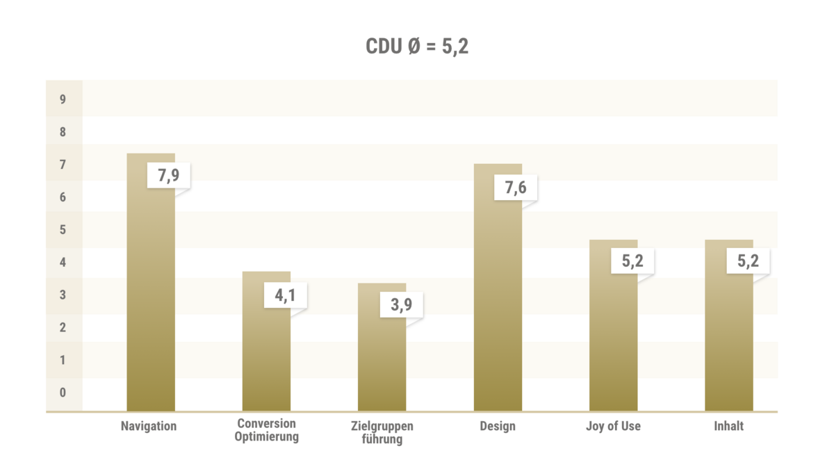 The menu itself is sensible and compact, but the visibility of the CDU election program is compromised. The menu navigation is also less user-friendly, as all subpages of the second menu level can only be accessed randomly. There are also minus points for the color choice of the menu, as it is sometimes difficult to read due to the color gradient.