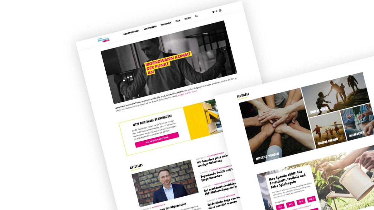 The FDP website is visually appealing overall, although the detailed pages are very text-heavy. The CD was taken into account for the website and interpreted in a modern way. Overall, the elements appear coherent and the first impression invites you to click further.