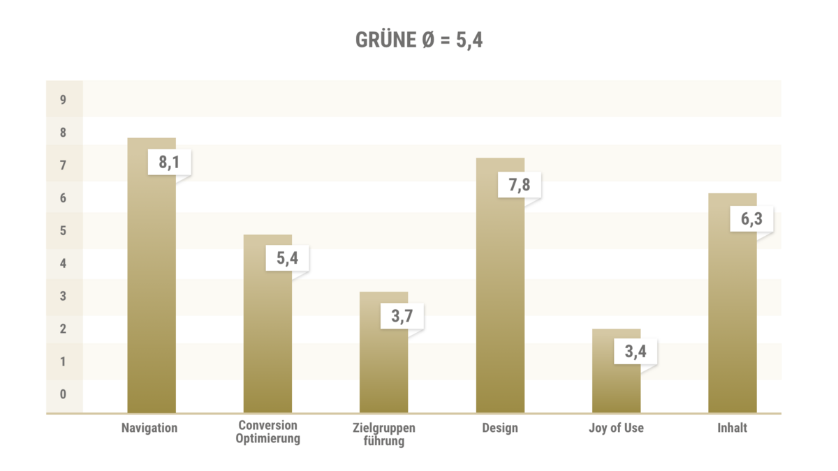 The overview pages are well designed, the detail pages need to be optimized. The Greens' CD has been interpreted in a modern way for the website, which looks very coherent overall. The first impression of the site is good overall, only the green above the images doesn't look healthy.