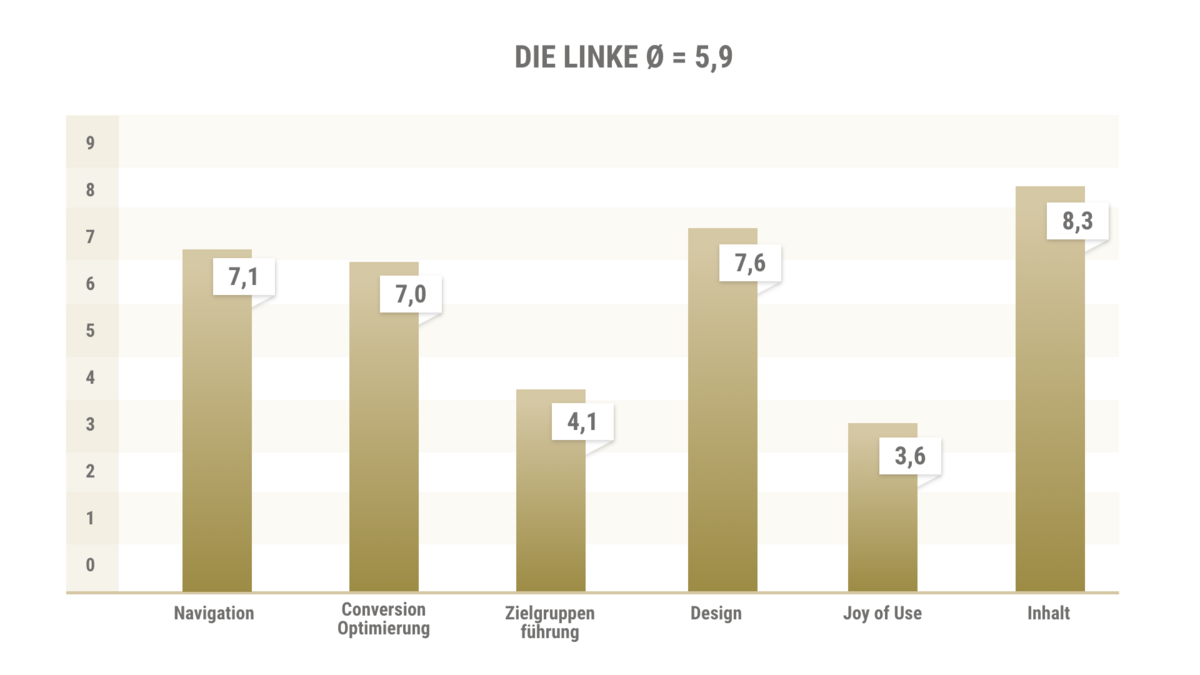 The analysis, which was as objective as possible, was not about personal preferences in design, but about how the individual areas work for the party website and users. Each individual category was rated with points from 1-10, with 10 being the maximum. This made it possible to determine which websites work better than others from a user experience perspective.