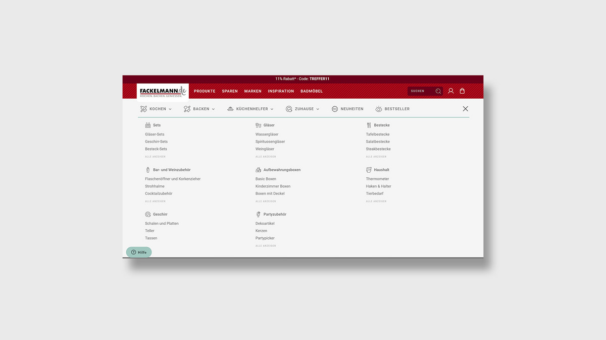 The page from Fackelmann is a good example of how a large number of menu items can be clearly displayed in a flyout. However, it should be emphasized that not all subcategories were displayed and the menu as a whole is not uniform. All in all, the design is not optimal. However, the flyout of the products is well done and the icons make it visually appealing and yet clearly arranged.
