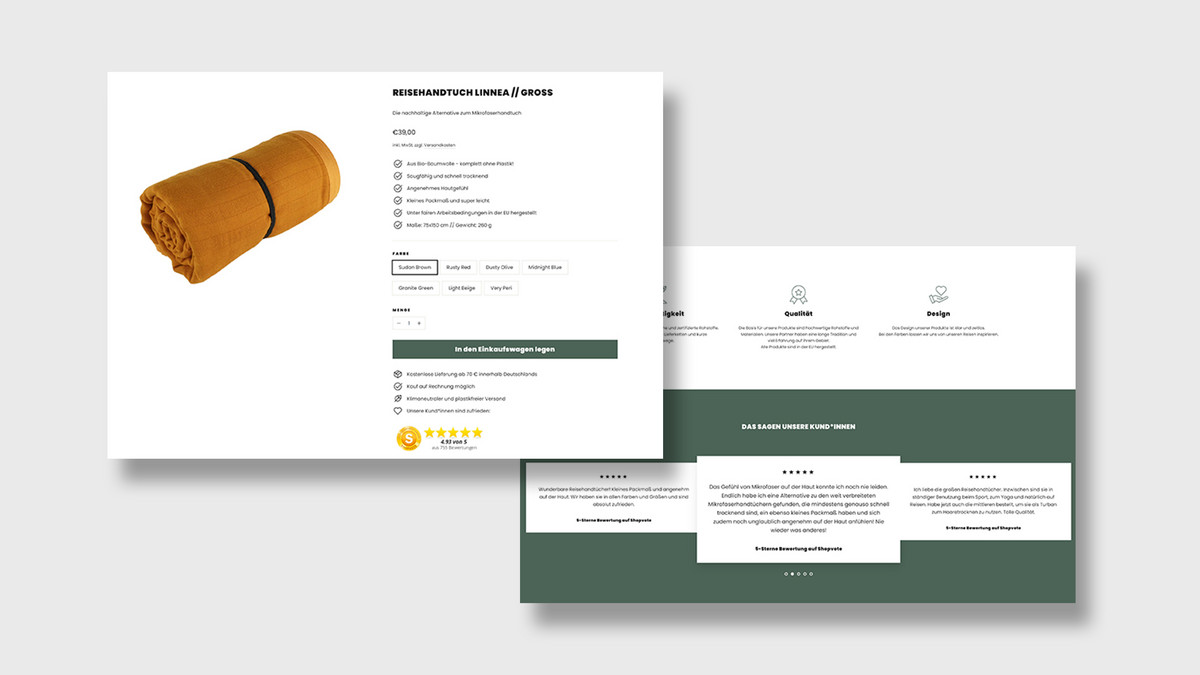 In the following example from Valleys & Hills, the first viewport of a product page can be seen. All relevant information is visible at first glance: product images, product name, price, USPs, color selection, quantity, button and shipping information. The overall design of the page is minimalist and compact. Nevertheless, all information is visible at first glance without overwhelming users. The only thing that could be improved at this point is the color selection, which is currently only displayed in text form. The page would be perfect with an actual preview of the colors as a color selection.