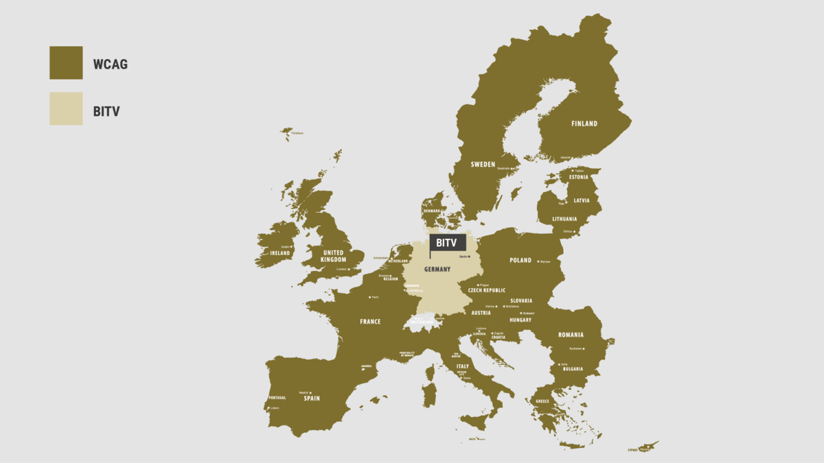The BITV (Barrier-free Information Technology Ordinance) is based on the WCAG guidelines for public websites of the federal government. It thus ensures the framework conditions for compliance with the WCAG in Germany.